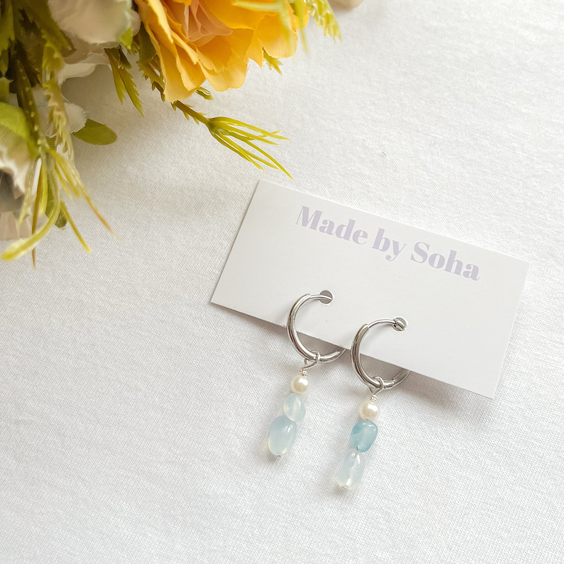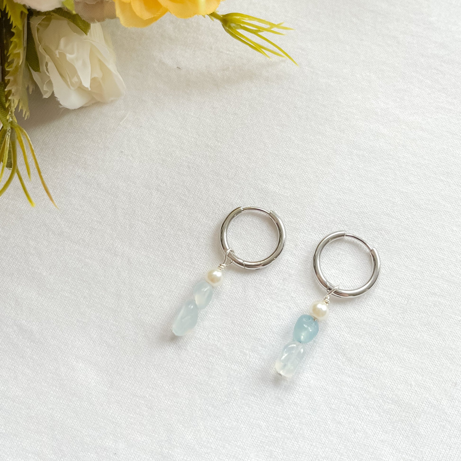 Elegant but with a modern twist; these huggie hoops feature delicate droplet charms adorned with natural aquamarine chips and luminous glass pearls. Lightweight and versatile, they add a graceful splash of color and sophistication to any look.