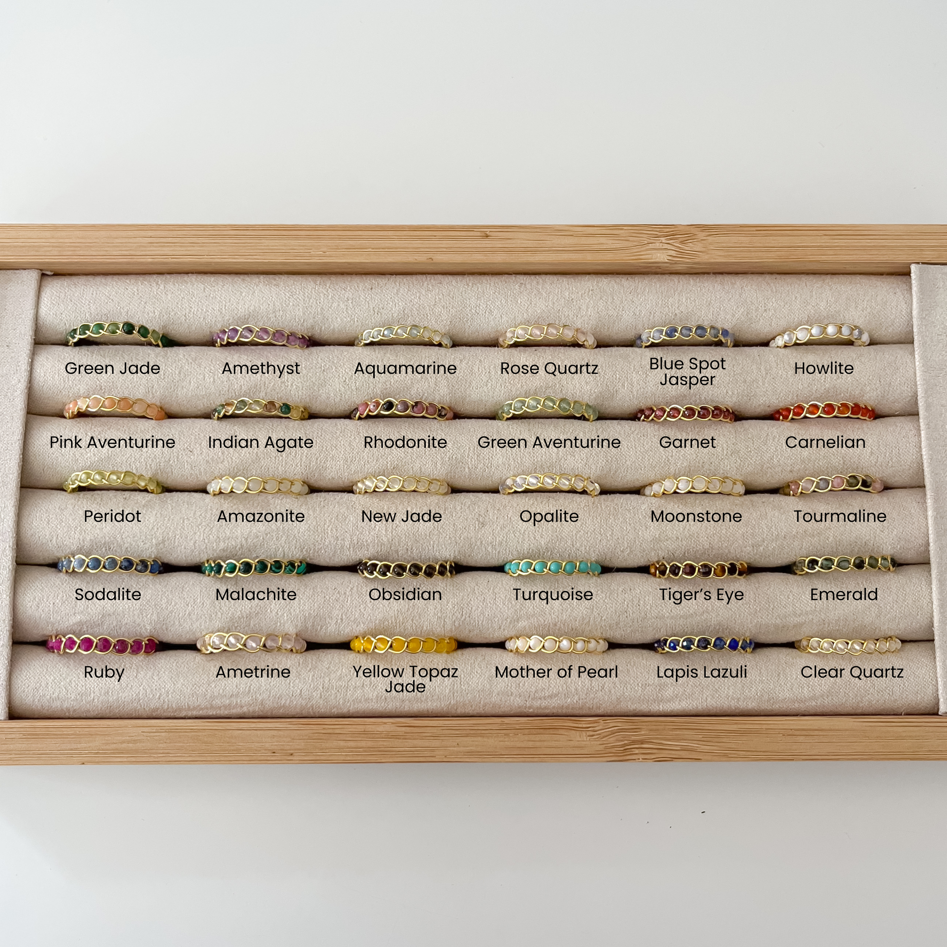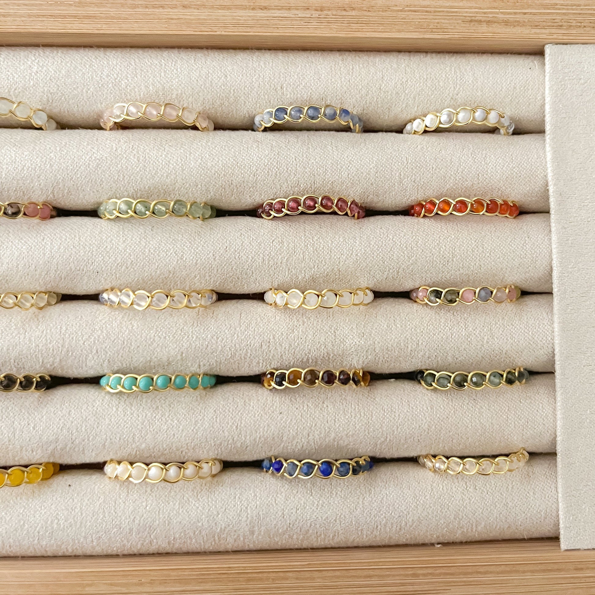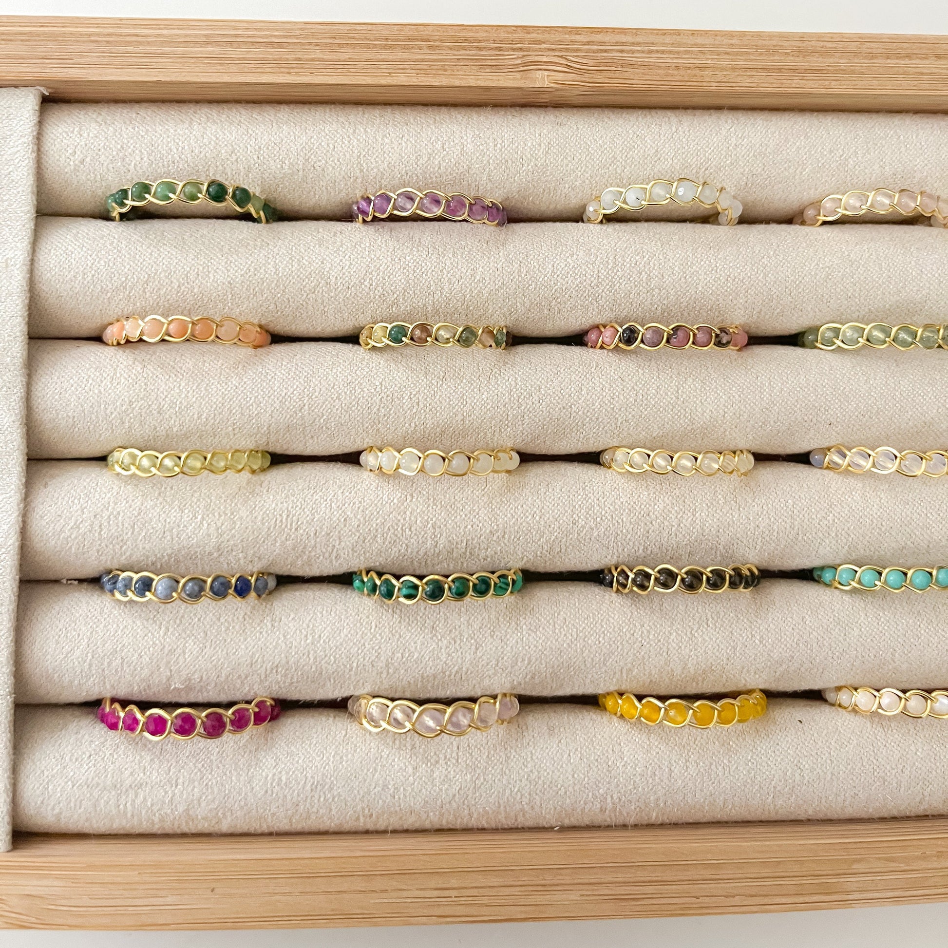 Bohemian and eye-catching, these rings feature vibrant gemstones braided with delicate gold-plated wire. A unique blend of texture, colour and shine, they are perfect for adding a touch of handmade artistry to any outfit.