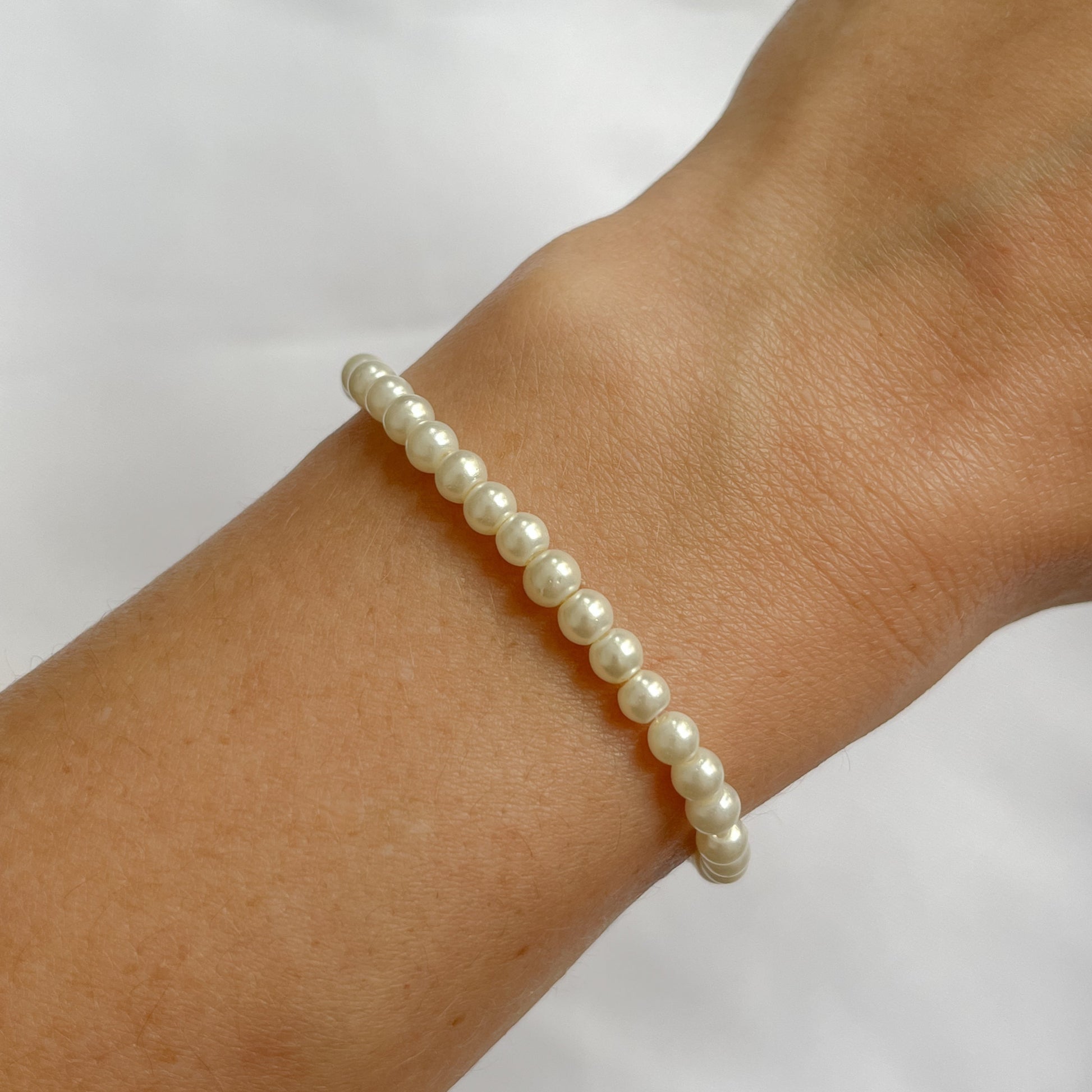 This elegant bracelet features delicate 4mm glass pearl beads in a soft ivory shade, expertly strung on a stretchy band for a comfortable and secure fit. Its timeless design adds a refined touch to any outfit, perfect for both everyday wear and special occasions.