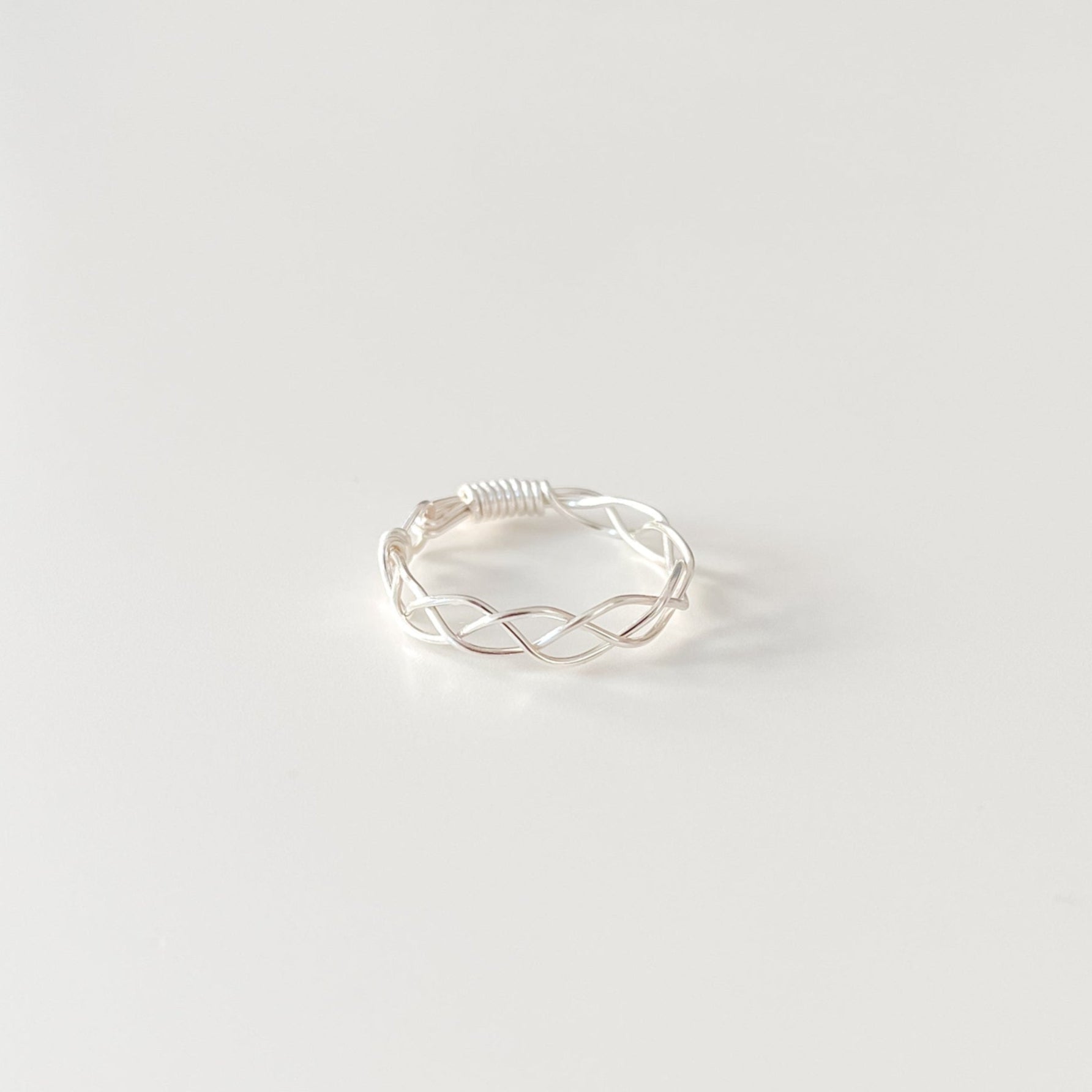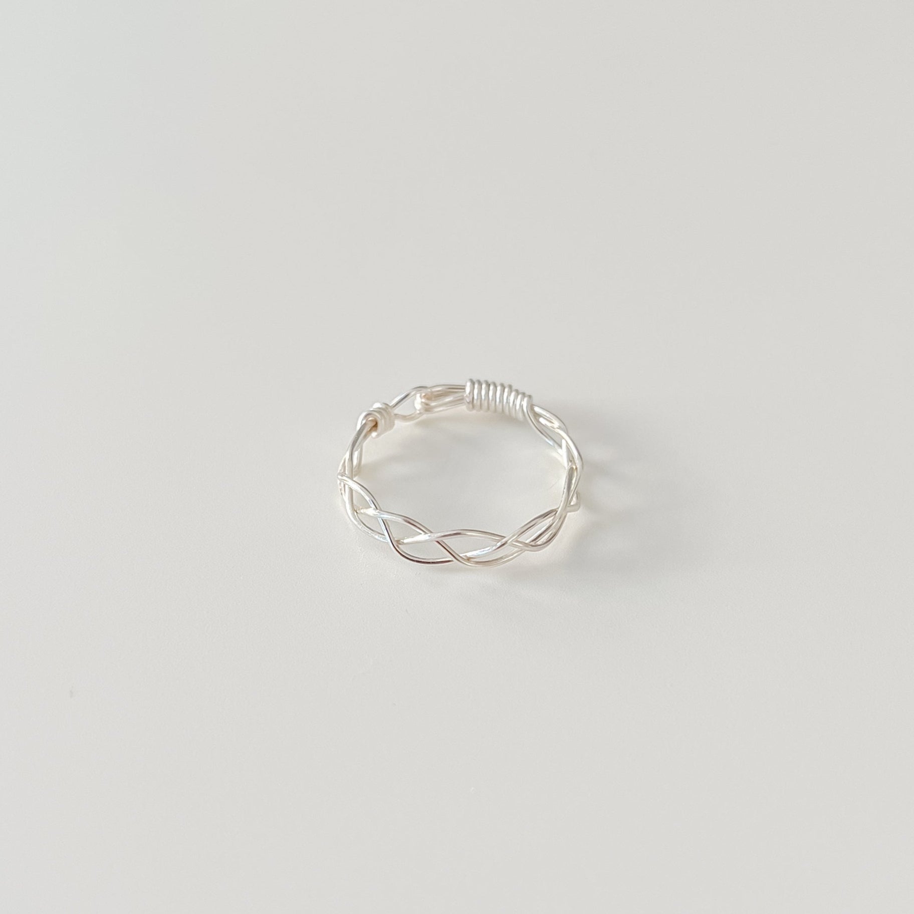 This silver braided ring features delicately intertwined wire strands, creating an elegant and refined look. Its intricate design offers a timeless accessory perfect for adding subtle sophistication to any outfit. Crafted with attention to detail, this ring blends simplicity with artistry for a graceful finish.
